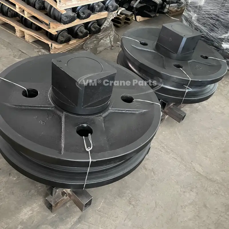 Each Hitachi Sumitomo SCX2000 and SCX2000A-2 crawler crane has 2pieces front idlers. The idler, together withthe HSC SCX2000 track pad, bottom roller, top roller, and sprocket, becomes a crawler crane undercarriage. Shandong Value Machinery can provide all of them!